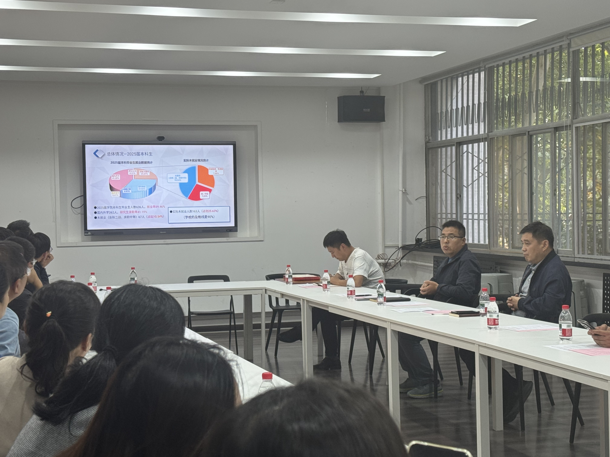 接着,翟雨翔深入分析了2025届本科生就业情况,重点分析了2025届本科生就业工作中存在的瓶颈和困难;通报了2026届本科生当前的就业形势和最新的就业考研摸底情况;提出了2025年秋季学期学院就业工作的四级工作体系及其职责分工,并对导师如何开展就业工作提出了几点建议。