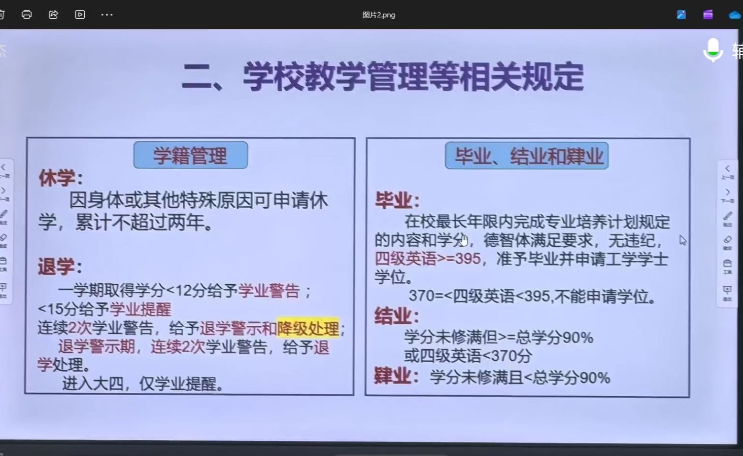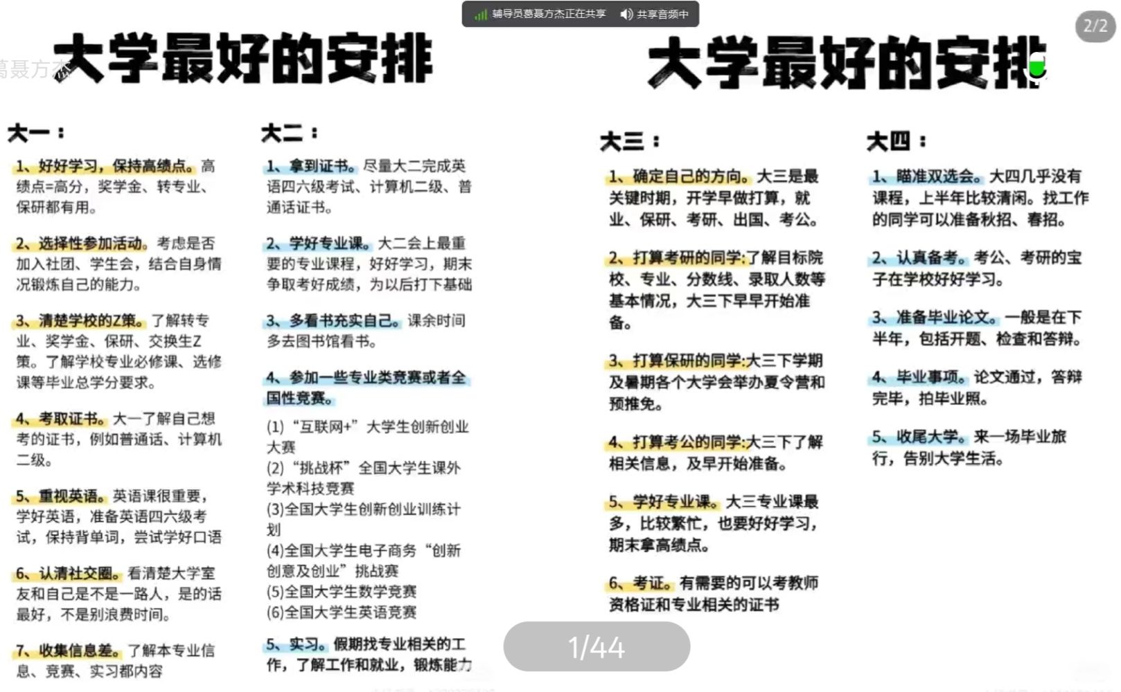 针对大二年级学生家长,会议聚焦学业深化与能力拓展。辅导员详细讲解了专业课程体系、科技创新竞赛、实习实践安排以及挂科、重修的相关管理规定与后续影响。特别强调了学业成绩在评奖评优、未来发展规划中的基础性作用,提醒家长关注学生的学业动态,协同学校做好督促与支持,避免因学业问题影响后续发展。同时,也全面介绍了考研、出国(境)深造、就业(包括校园招聘、就业协议签订等)等不同路径的现状、资源与注意事项。会议旨在帮助家长清晰了解毕业季的关键任务与时间线,以便更好地配合学校,引导学生根据自身情况,理性选择、充分准备、积极应对。
