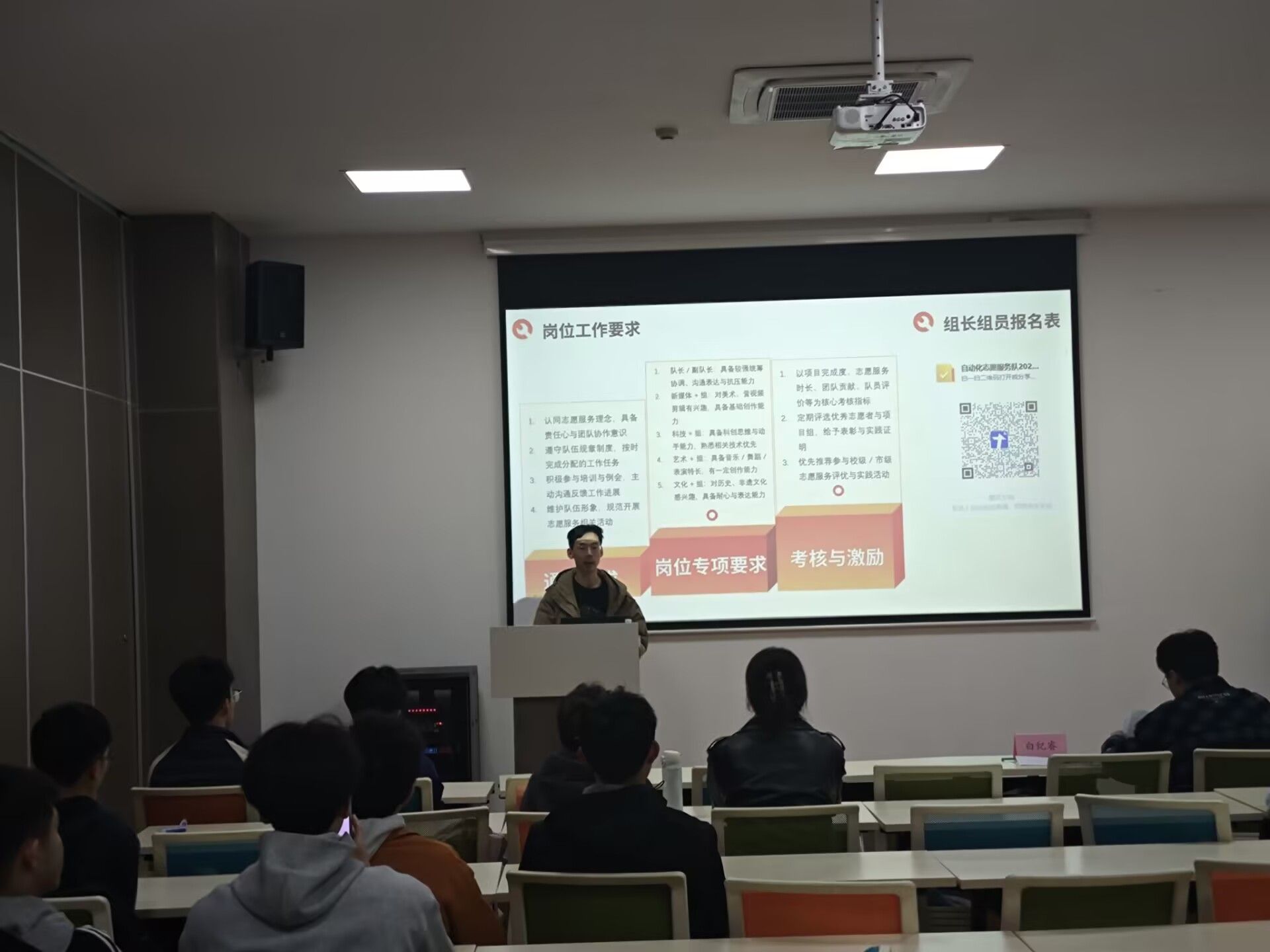 会议伊始,服务队负责人全面总结了纳新工作成果,并对服务队组织架构、岗位职责进行详细说明,明确了各部门分工协作机制。随后,围绕学期内重点志愿活动规划、志愿服务流程规范、志愿者考核激励机制等核心内容展开深入部署,细化活动策划、执行、复盘等环节要求,同时强调志愿服务中的安全保障与沟通协作要点。新成员代表依次发言,分享入队感悟,表达积极投身志愿工作的决心,现场氛围热烈而有序。指导老师对服务队前期工作进行了总结与思考,并结合学院特色与社会需求提出明确要求:一是要坚守志愿初心,打造具有自动化专业特色的志愿服务品牌;二是要强化责任意识,提升服务质量与专业素养;三是要凝聚团队力量,营造互助共进的良好氛围。