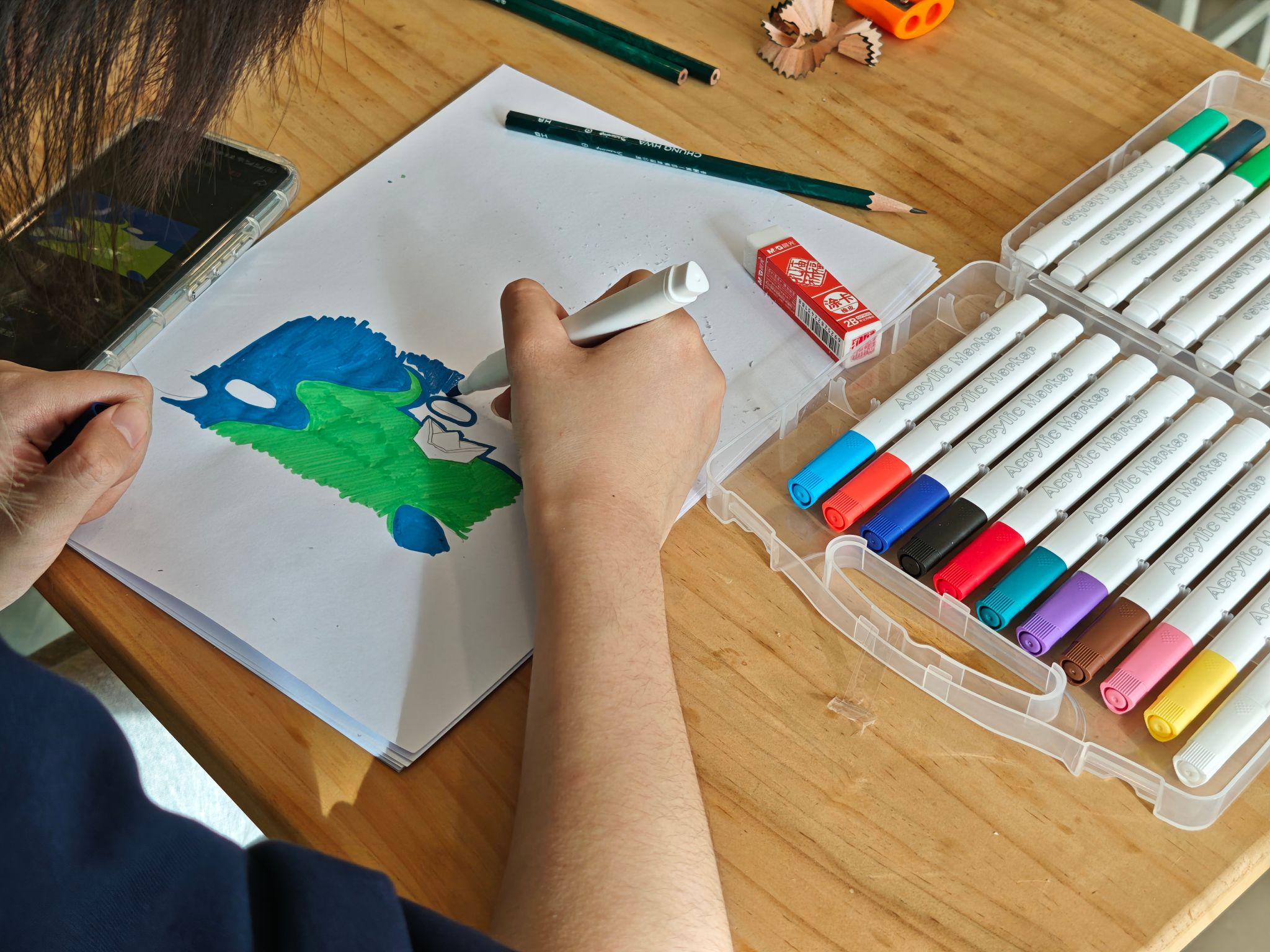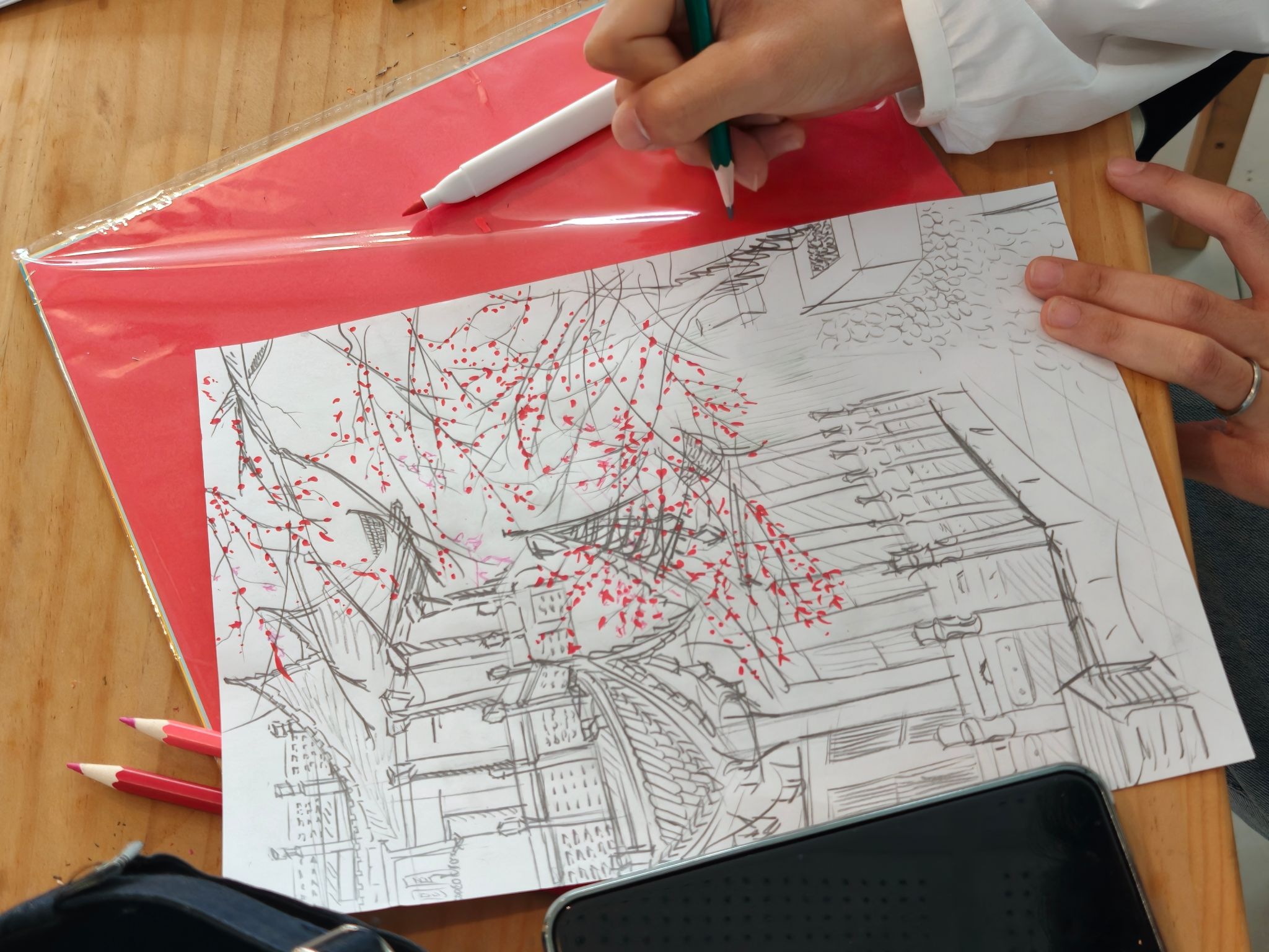 活动伊始,李美琦老师介绍了活动理念,强调书画不仅是美育的重要载体,更是心理疏导的有效路径,鼓励大家放下技法束缚,以笔墨为媒介抒发内心感受。活动现场,房树人绘画区与水写布创作区同步开放,同学们或用铅笔勾勒房、树、人,将心底情绪诉诸笔端,在老师的轻量引导下读懂自我、交流心声,还以彩笔增添治愈元素;或跟随志愿者学习握笔运笔,借助呼吸练字法静心凝神,书写励志话语,写错可随时擦拭,全无创作压力。活动尾声,大家将满意作品复刻在卡纸上,在自由逛展中分享灵感,社恐同学也能轻松参与。