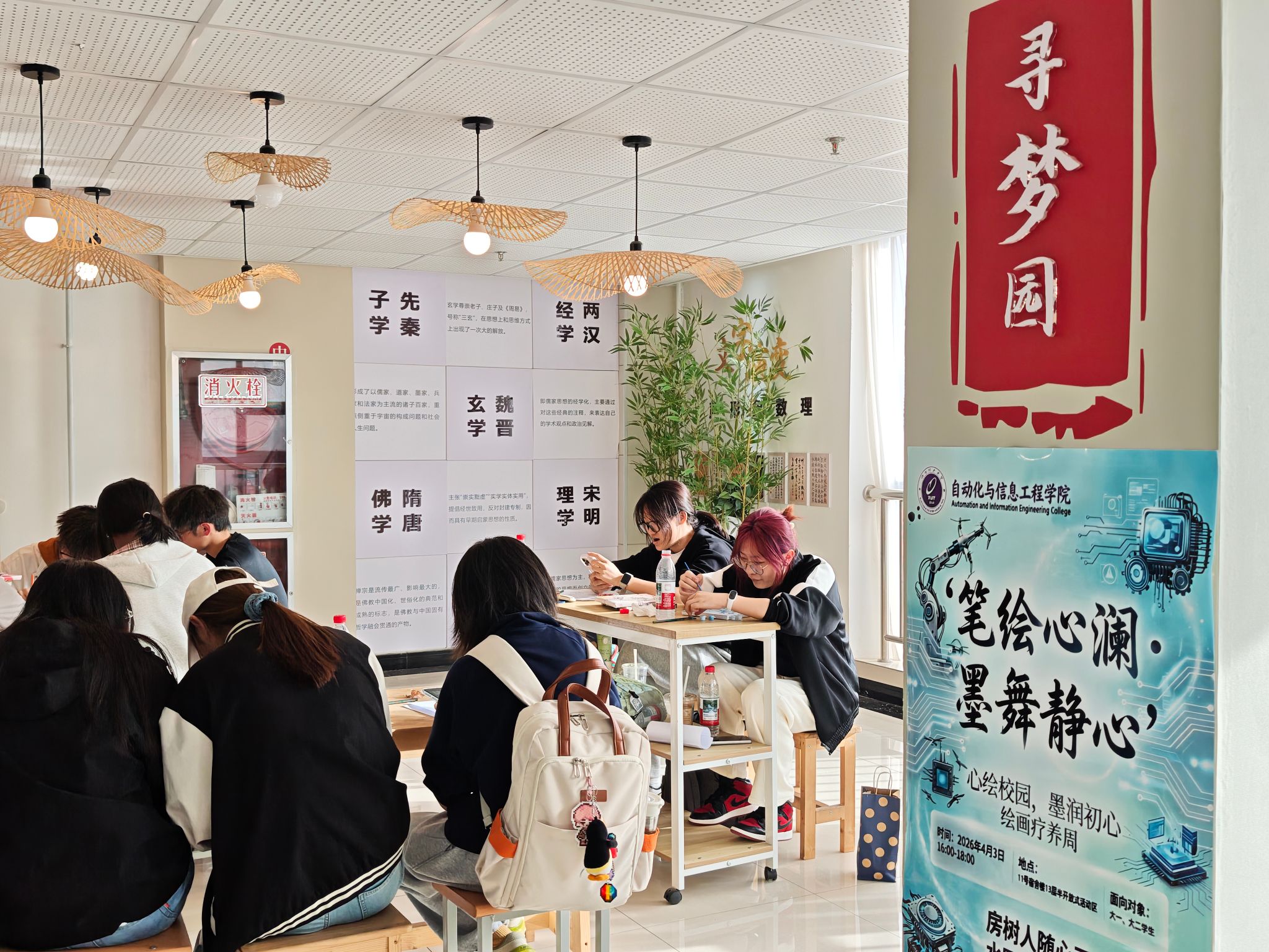 为涵养学生积极心态,引导同学们在笔墨创作中舒缓学业压力、调适身心状态,4月3日,自动化学院于曲江校区一站式学生社区11号楼多功能教室成功举办“园润心灵”心理健康主题活动。本次活动由心理辅导员李美琦老师主持,面向曲江校区大一、大二学生,紧扣“笔绘心澜,墨润初心”核心主题,以绘画、书法为载体,深度融合心理疗愈、美育实践与自动化专业特色,响应“五育并举”教育方针,设置双创作区域同步开展,为同学们打造了一场沉浸式静心疗愈之旅。