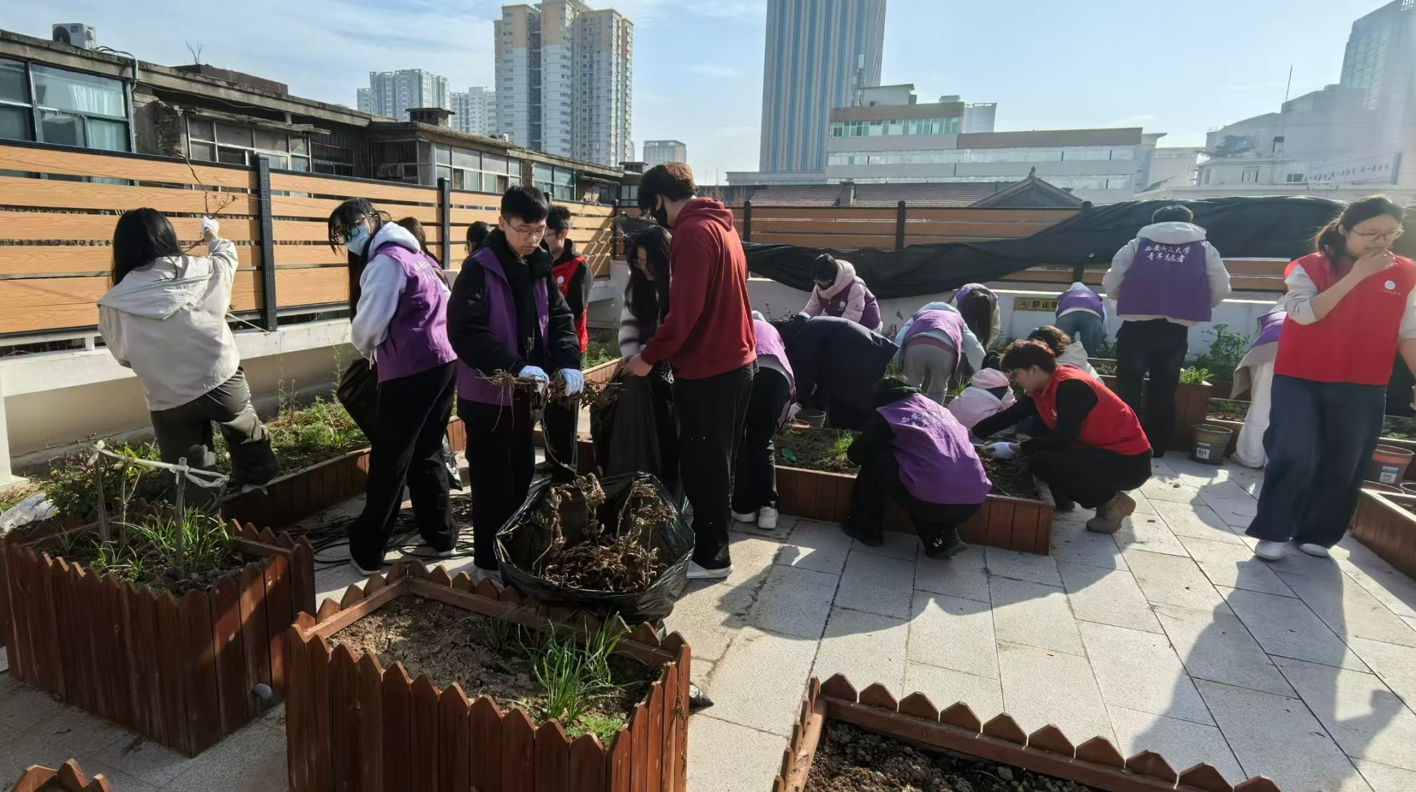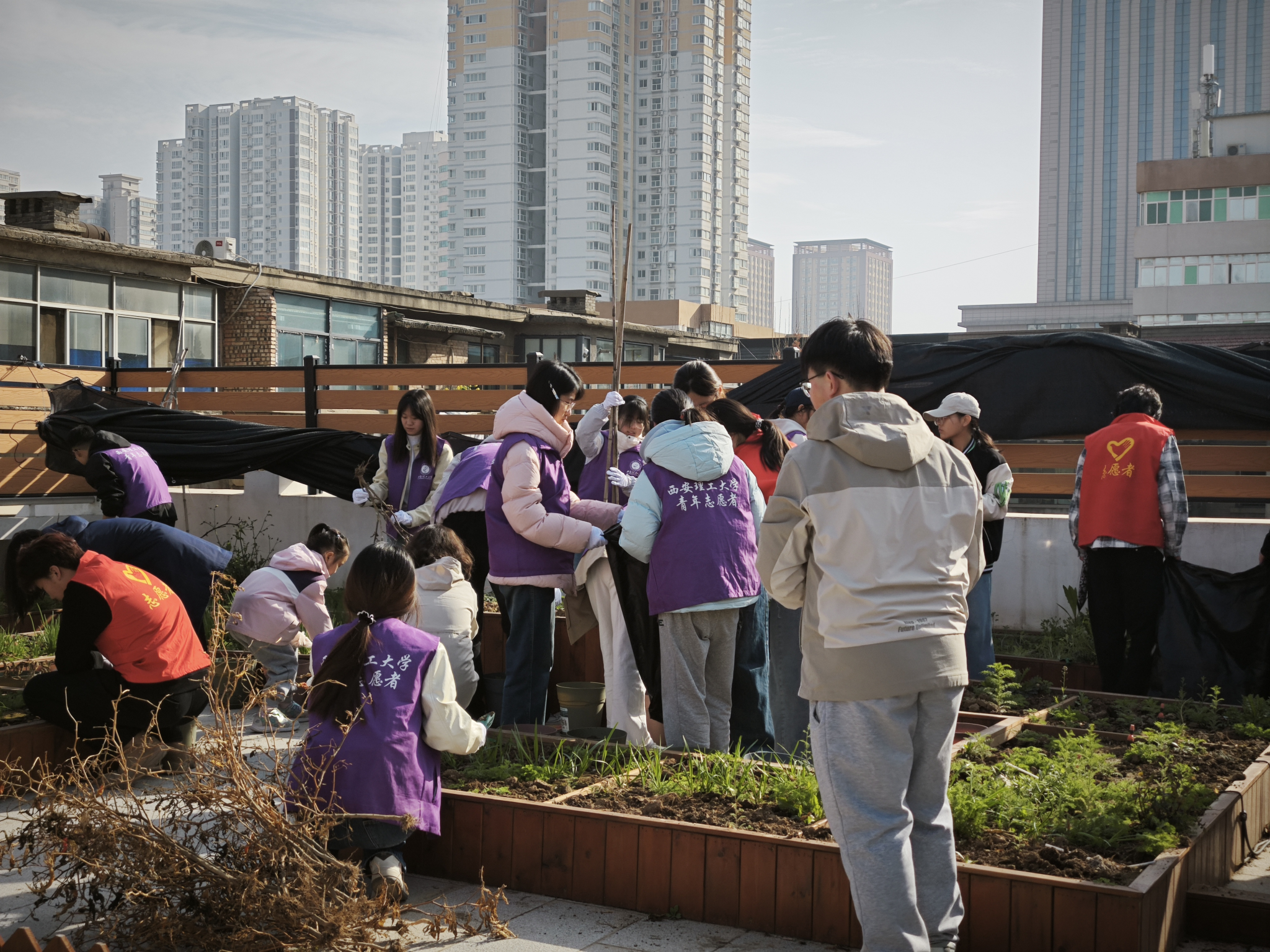同日,志愿者们走进“国家电宝梦工厂”项目基地,开展零碳露台农工合作志愿活动,完成拆旧清枯、除草翻土、播种育苗等工作,打造绿色农耕空间,助力青少年农耕科普教育,以实干传递绿色发展理念。