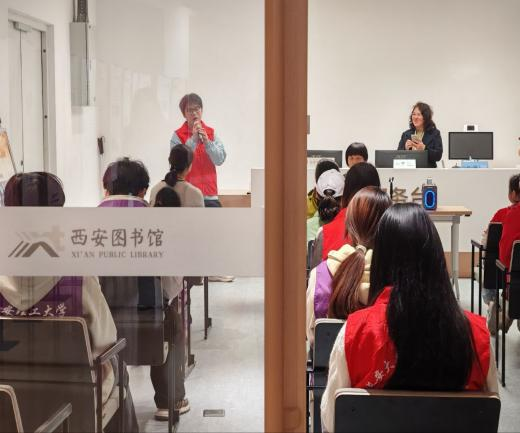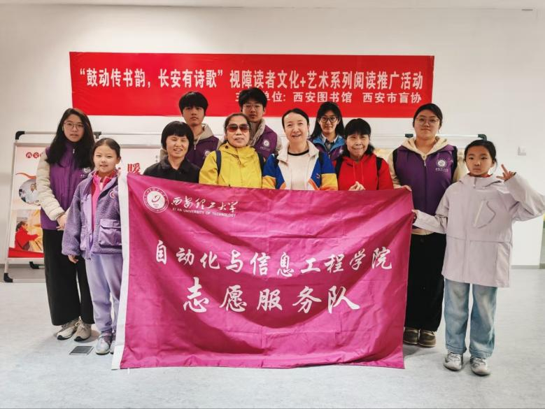 学院志愿服务队深耕文化公益领域,开展多项暖心志愿服务。3月21日,志愿者们走进西安市图书馆,助力“鼓动传书韵,长安有诗歌”视障读者文化活动,为视障朋友提供一对一引导服务,全程陪同参与诗歌诵读与乐器体验,用陪伴搭建无障碍文化桥梁,传递平等包容的人文温度。
