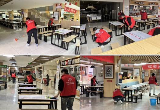 活动期间,支部全体成员积极投身劳动实践,大家同餐厅工作人员迅速投入到忙碌而有序的劳动中。在第一餐厅内,同学们携带清洁工具,分工协作,对餐桌椅、取餐台、地面及周边区域进行了全方位细致清理。