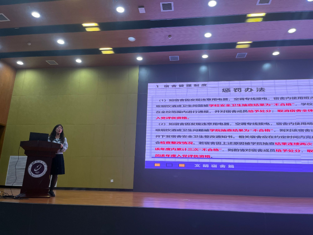 在解读制度的基础上,进一步介绍了 “文明宿舍” 的评选标准与创建意义,为新生树立宿舍建设的“目标导向”。评分指标涵盖卫生环境、安全规范、文化建设、集体协作四大维度 —— 卫生方面要求“每日清扫、每周大扫除,物品摆放整齐、无卫生死角”;安全方面要求“无违禁品、无违规行为,安全检查零扣分”;文化建设方面鼓励宿舍成员共同设计宿舍文化墙、制定宿舍公约;集体协作方面则考察室友间互助情况、参与宿舍集体活动的积极性。